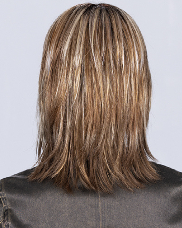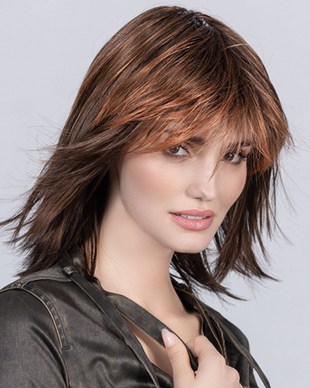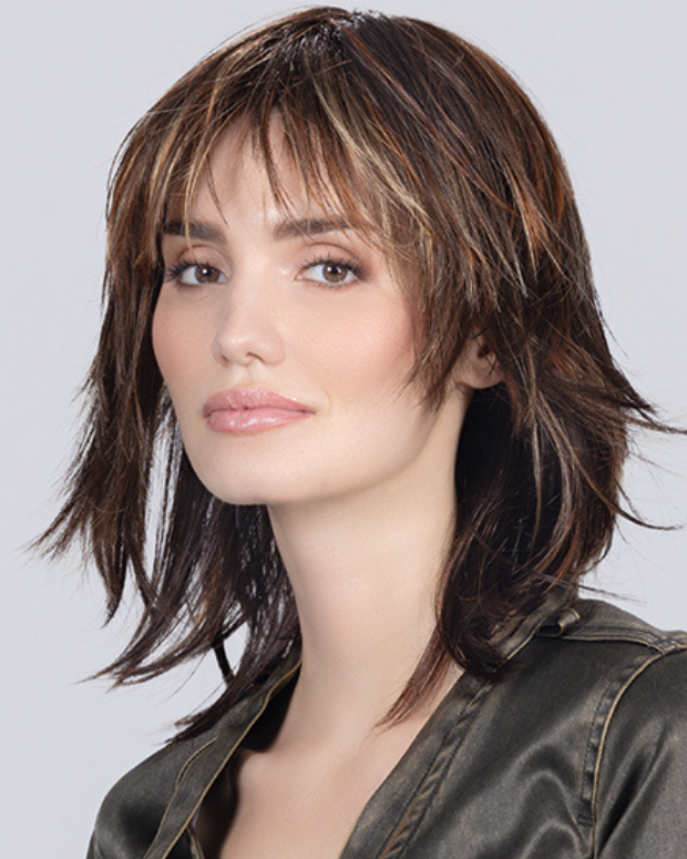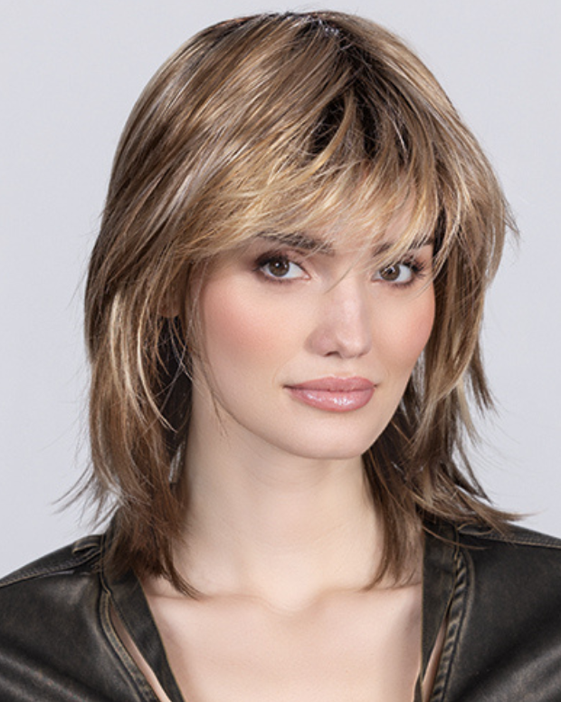 Layered shoulder-length style, feathered fringe, monofilament crown, and wefted cap for natural, low-maintenance wear.