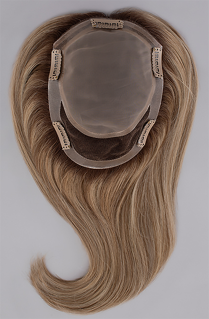Designed with comfort as top priority, Top Comfort is made with a double monofilament top, silky smooth to the touch, and a hand tied back for the most natural movement. Featuring premium Remy Chinese human hair, Top Comfort is ideal for those experiencing beginning to mid/progressive hair loss and looking for more coverage in the top and crown area. This topper features a double monofilament base, hand tied back, and an all-around larger polyurethane perimeter with five strategically placed pressure sensitive clips that can be removed if Tape ‘N Go or adhesive is applied. Available in 12-inch hair length. Love the beautiful volume shown? Check out our EasiPieces Clip-In Hair Volumizers, available in 8”, 12” and 16” lengths.