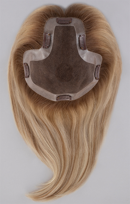 The EasiPart T human hair topper transforms fine or thinning hair by adding density and body. This voluminous topper has a wider T-shaped base for more all-over coverage, and larger polyurethane perimeter allowing easier application of Tape ‘N Go or adhesive. Available in 12- and 18-inch lengths. Love the beautiful volume shown and want to create this look for yourself? Check out our EasiPieces Clip-In Hair Volumizers, available in 8”, 12” and 16” lengths. The Cap base dimensions are (W) 3" - 7.25" x (L) 6.75"
