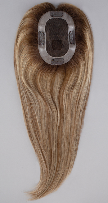 The EasiPart Medium human hair topper transforms fine or thinning hair by adding density and body. This voluminous topper has a wider base for more all-over coverage, and larger polyurethane perimeter allowing easier application of Tape ‘N Go or adhesive. Available in 12- and 18-inch lengths. Looking to create this volumous look for yourself as shown? Check out our EasiPieces Clip-In Hair Volumizers, available in 8”, 12” and 16” lengths. The cap base size is 4" X 5.5"