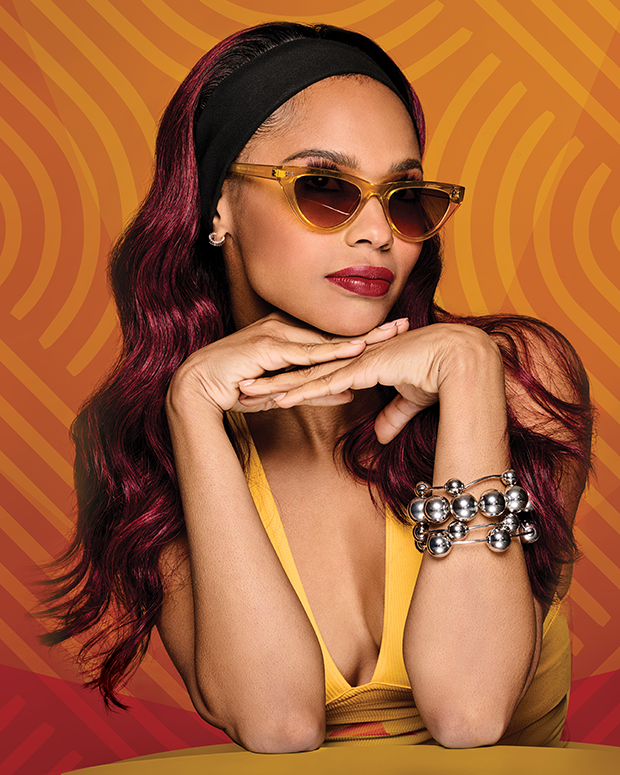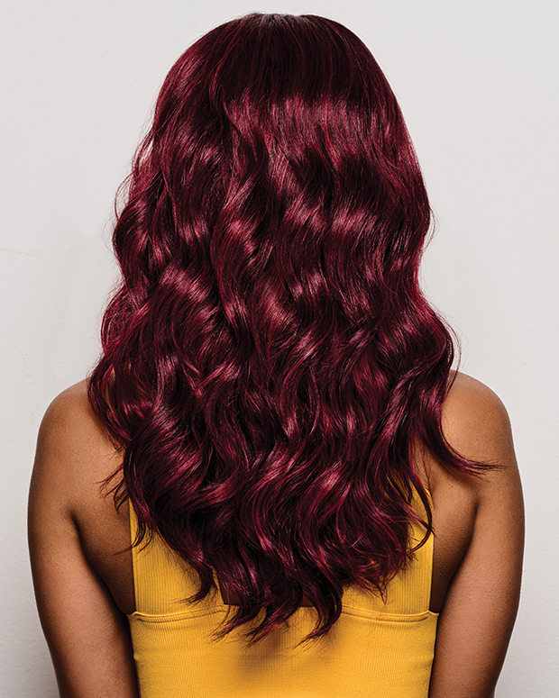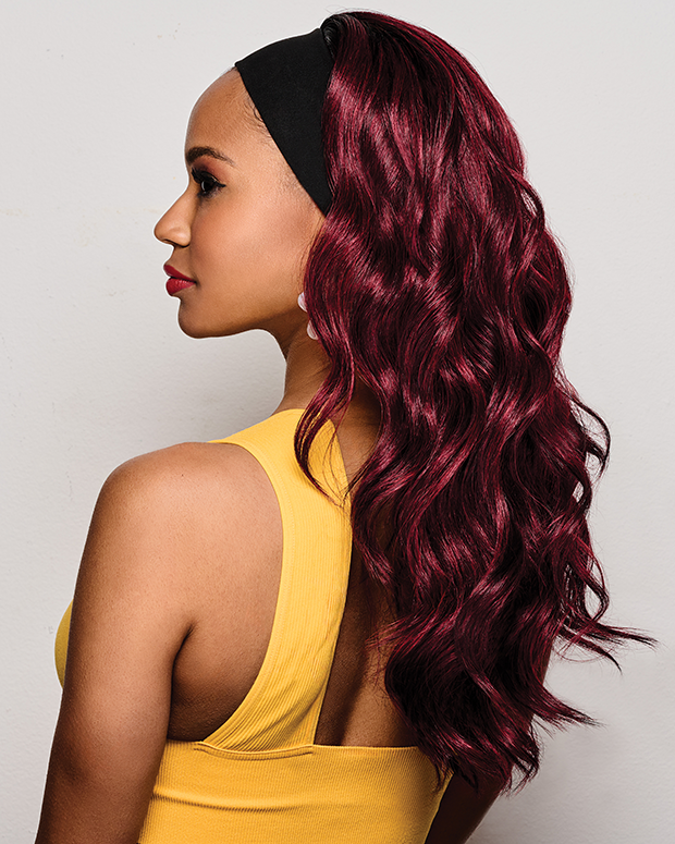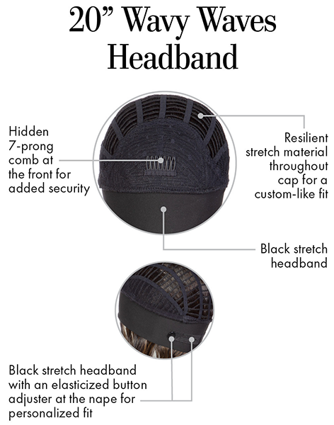 Fashionable, fast and foolproof! A headband wig of long loose waves trimmed in tapered layers to be shorter in the front, longer in the back.
