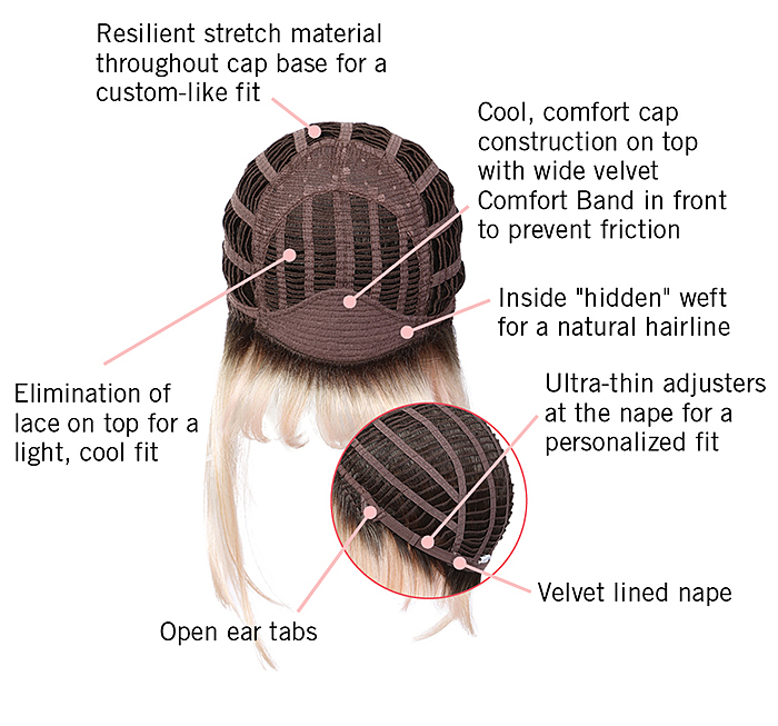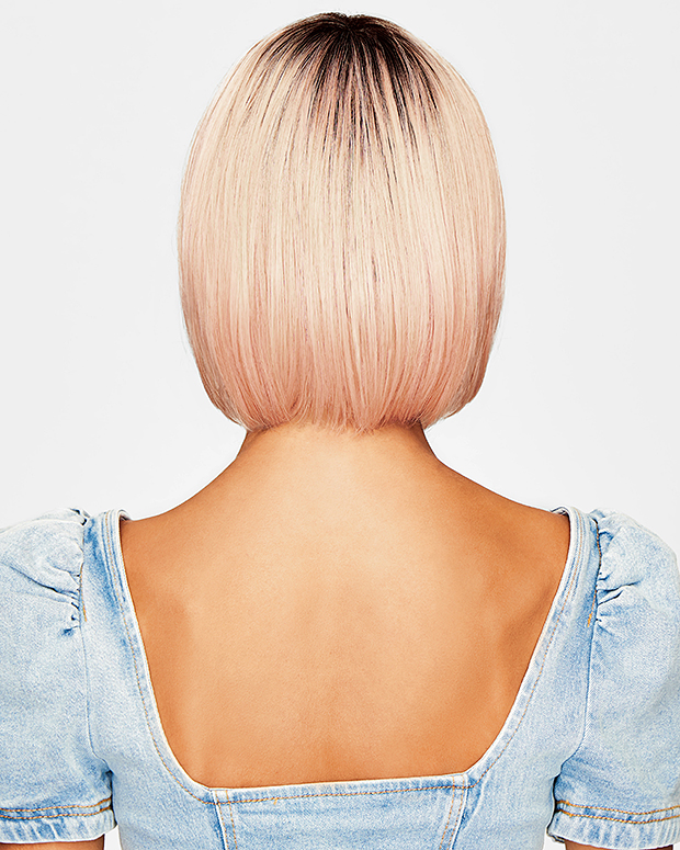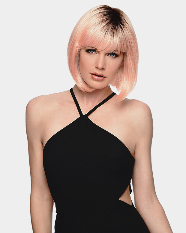 The perfect shade of peachy pink can now be yours without commitment. This pastel color trend is paired with a bob cut, making it classic yet edgy. The multi-faceted color has a darker root to add contrast and a natural look. Have your hairstylist customize the bang and style the Tru2Life® heat-friendly synthetic hair with a curling iron or flat iron. The cap is made to be light and as cool as you. 240°F (116°C) is the perfect temperature for styling. Do not go above 350°F/180°C.