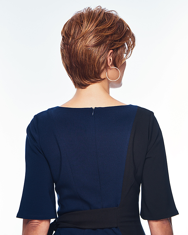 Loose and light layers with beautifully natural movement can be worn forward onto the face, swept away, or casually tucked behind the ears. A feather-cut nape adds the finishing touch to this pretty feminine style. Made with Tru2Life® heat-friendly synthetic hair that can be flat-ironed, curled or blown out.